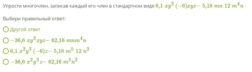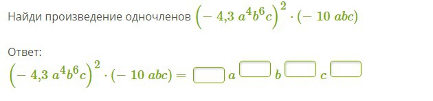 Задание 1. (- 4,3a⁴b⁶c²)² * (- 10abc) = 18,49a⁸b¹²c⁴ * (- 10abc) = - 184,9a⁹b¹³c⁵. Задание 2. 6,1ху² * (-6)xyz - 5,18mn * 12m⁴n = - 36,6x²y³z - 62,16m⁵n².
