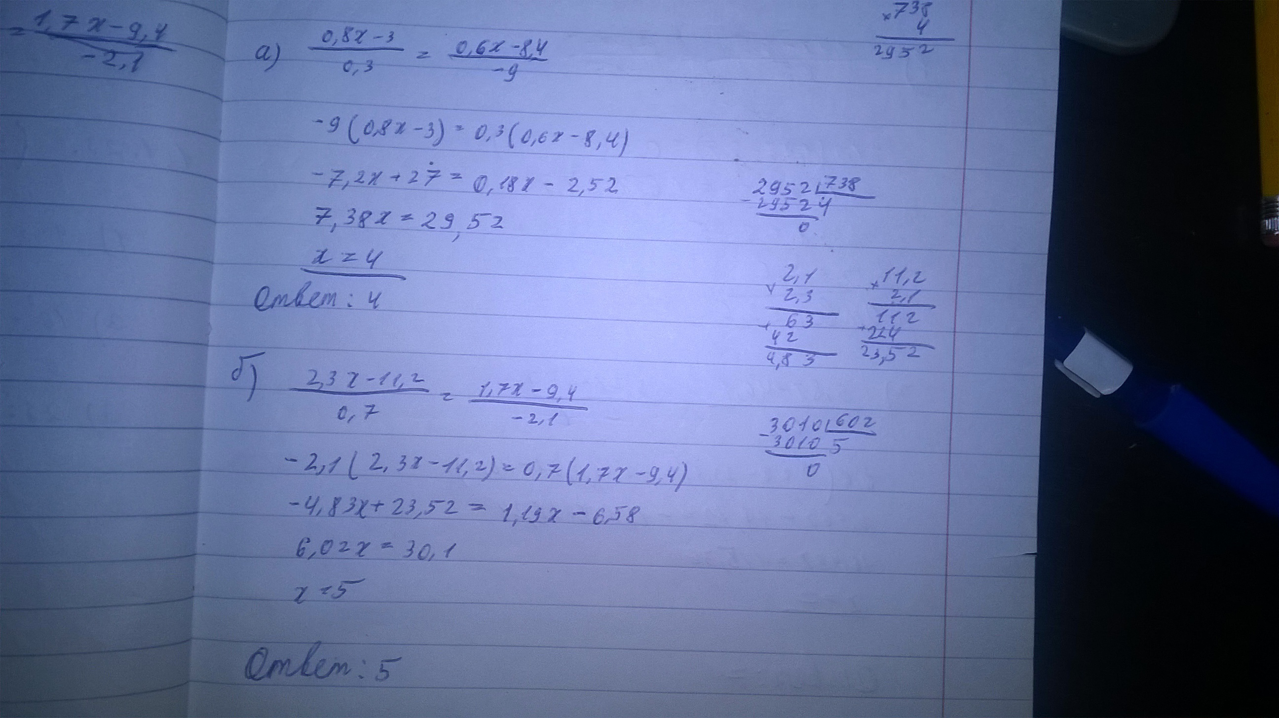 б) 2,3х - 11,2 / 0,7 = 1,7х - 9,4 / - 2,1