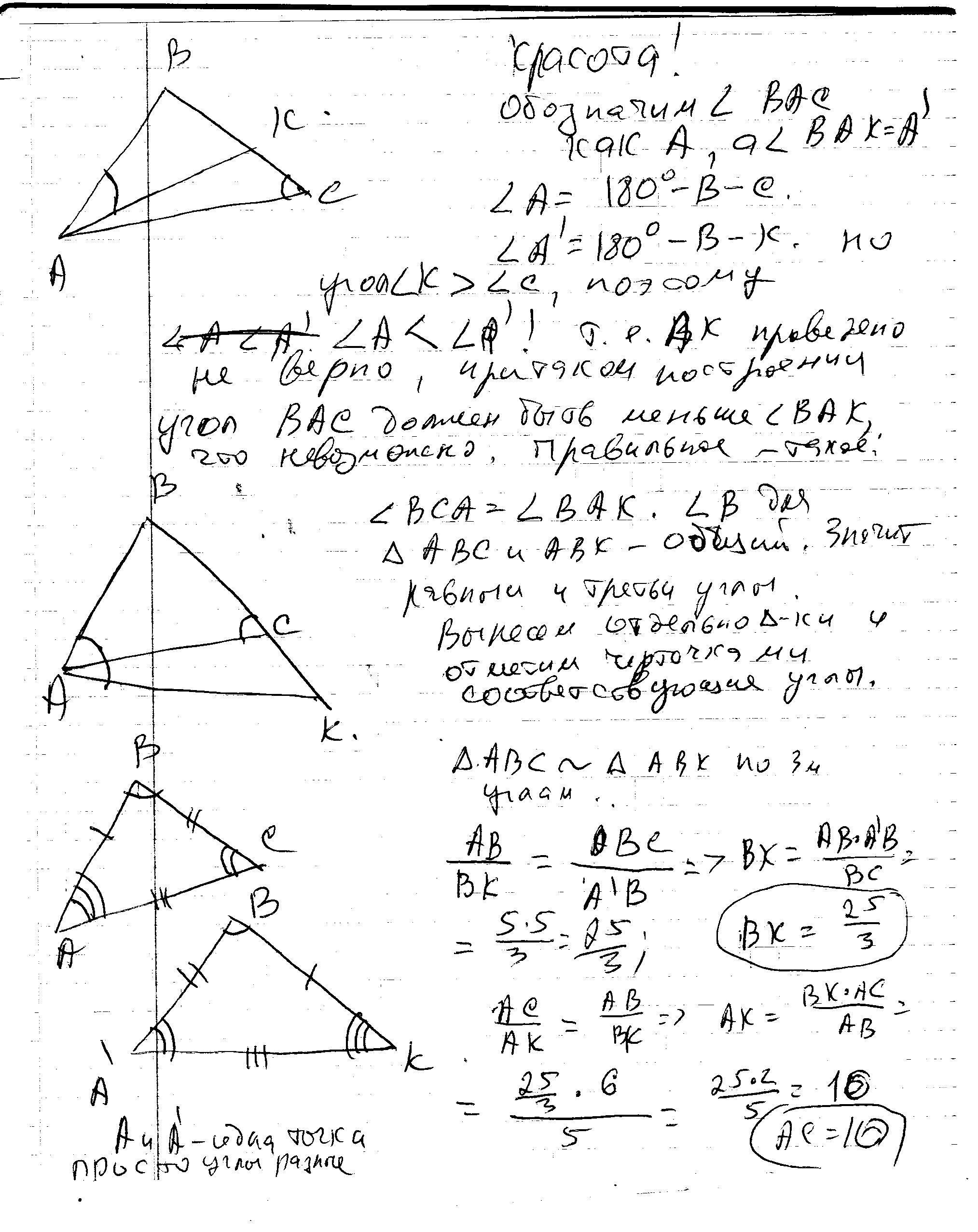 Дан ΔABC : AB=5, BC=3, AC=6. На луче BC взята точка K такая, что ∠BAK=∠BCA. Чему равны стороны ΔABK?