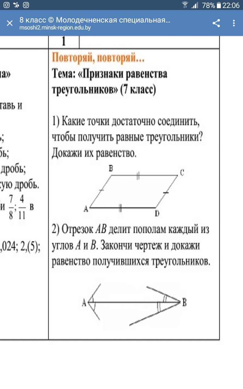 1) Соединить А и С, получим равные треугольники по равенству сторон, соединить В и D Также получим равные треугольники по равенству сторон.