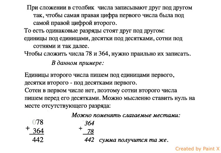 При сложении многозначных чисел решение примеров удобно записывать столбиком так, чтобы единицы были записаны под единицами, а десятки – под десятками. . Слева от чисел ставится знак «+» и проводится черта под числами. Под ней будет записываться сумма. Подробнее – в приложении.