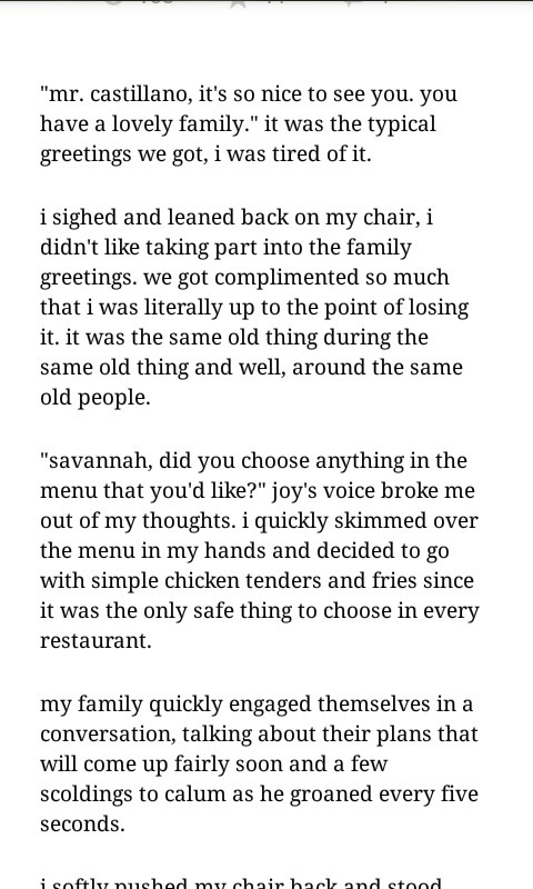 "Саванна,ты выбрала что-нибудь из меню?" Голос Джоя вырвал меня из своих размышлений. Я быстро пробежалась глазами по меню и решила остановить свой выбор на курице с картошкой,так как это,как мне показалось,было самым безопасным в этом ресторане.