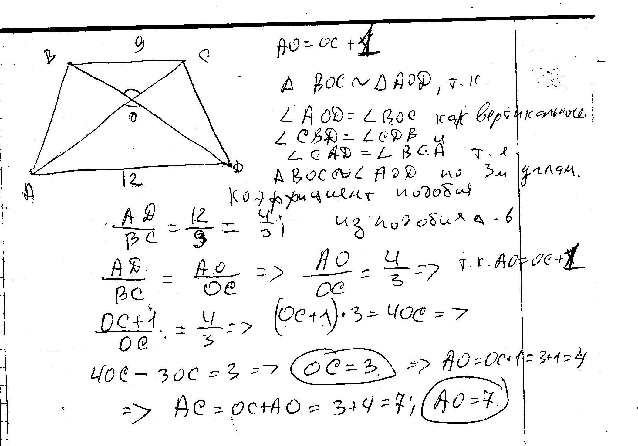 Помогите решить!!! Основы трапеции АВСD равны 9 и 12 см, а диагональ АС делится точкой пересечения диагоналей на отрезки, разница которых составляет 1 см. Найдите диагональ АС трапеции.