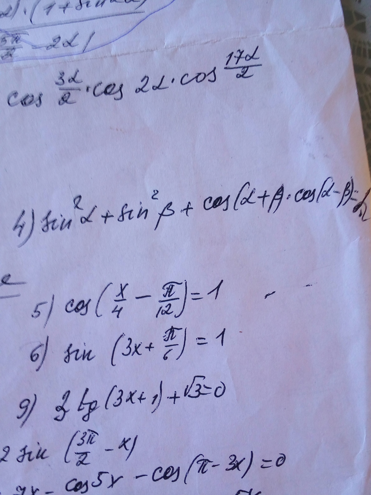 sin²α+sin²β+1/2*(2cos((2α+2β)/2)*cos((2α+2β)/2))=sin²α+sin²β+1/2(cos2α+cos2β)=sin²α+sin²β+1/2(1-2sin²α+1-2sin²β)=sin²α+sin²β+1/2(2-2sin²α-2sin²β)=sin²α+sin²β+1-sin²α-sin²β=1