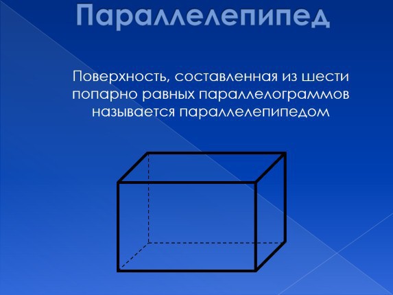 Параллелепипед – многогранник, у которого шесть граней и каждая из них параллелограмм.Прямоугольный параллелепипед – это параллелепипед, у которого все грани прямоугольники.