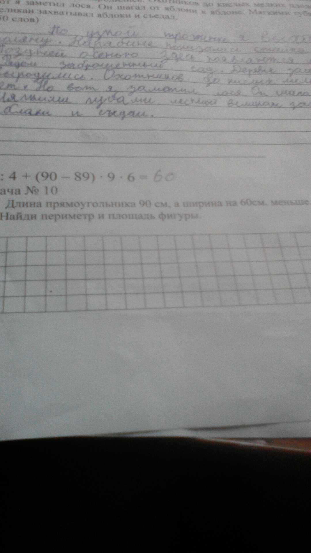 длина прямоугольника 90см, а ширина на 60см. меньше . Найди периметр и площадь фигуры