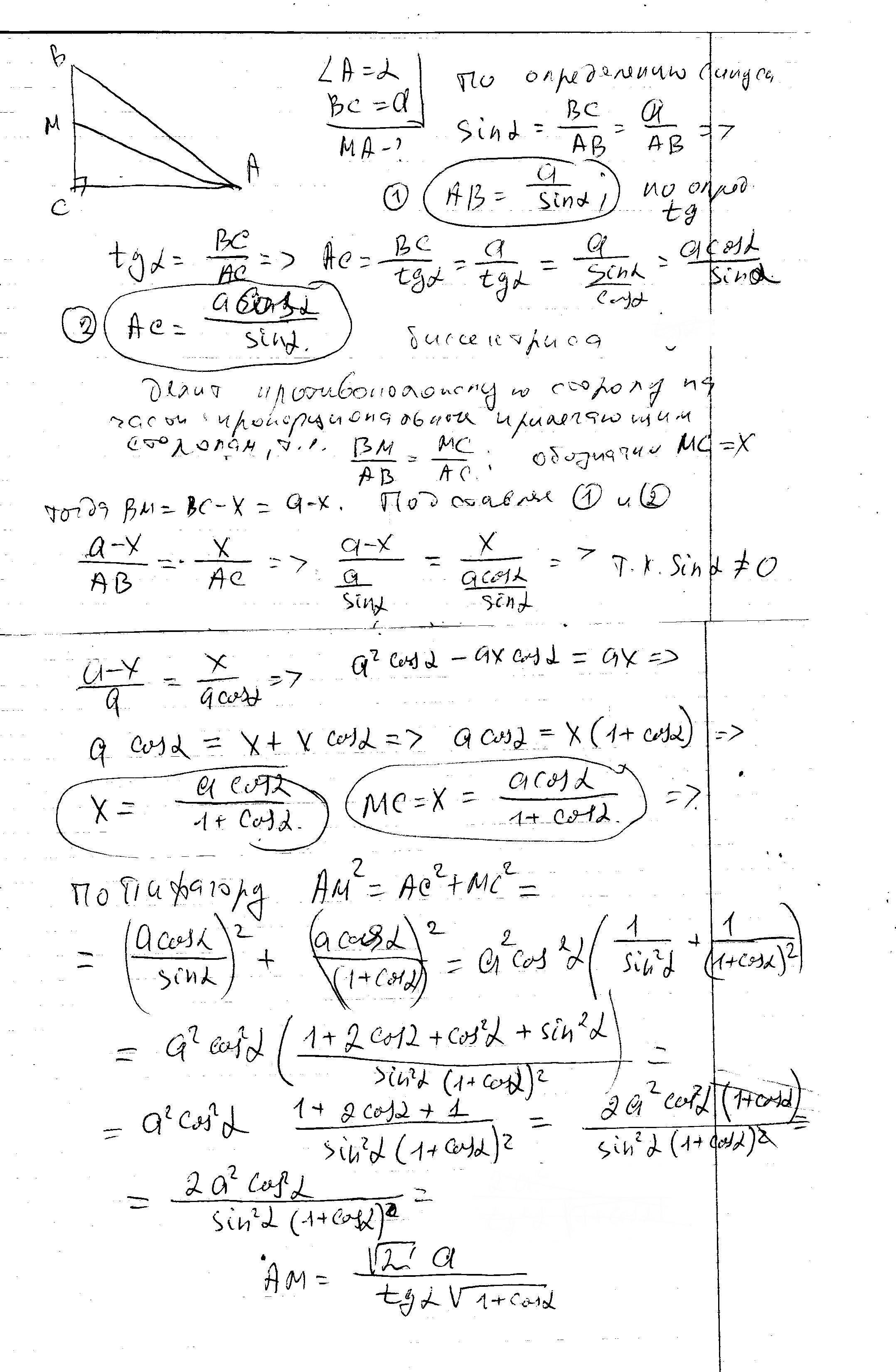 В прямоугольном треугольнике АВС угол А равен альфа, а противолежащий катет СВ равен а. Найти биссектрису угла ВАС