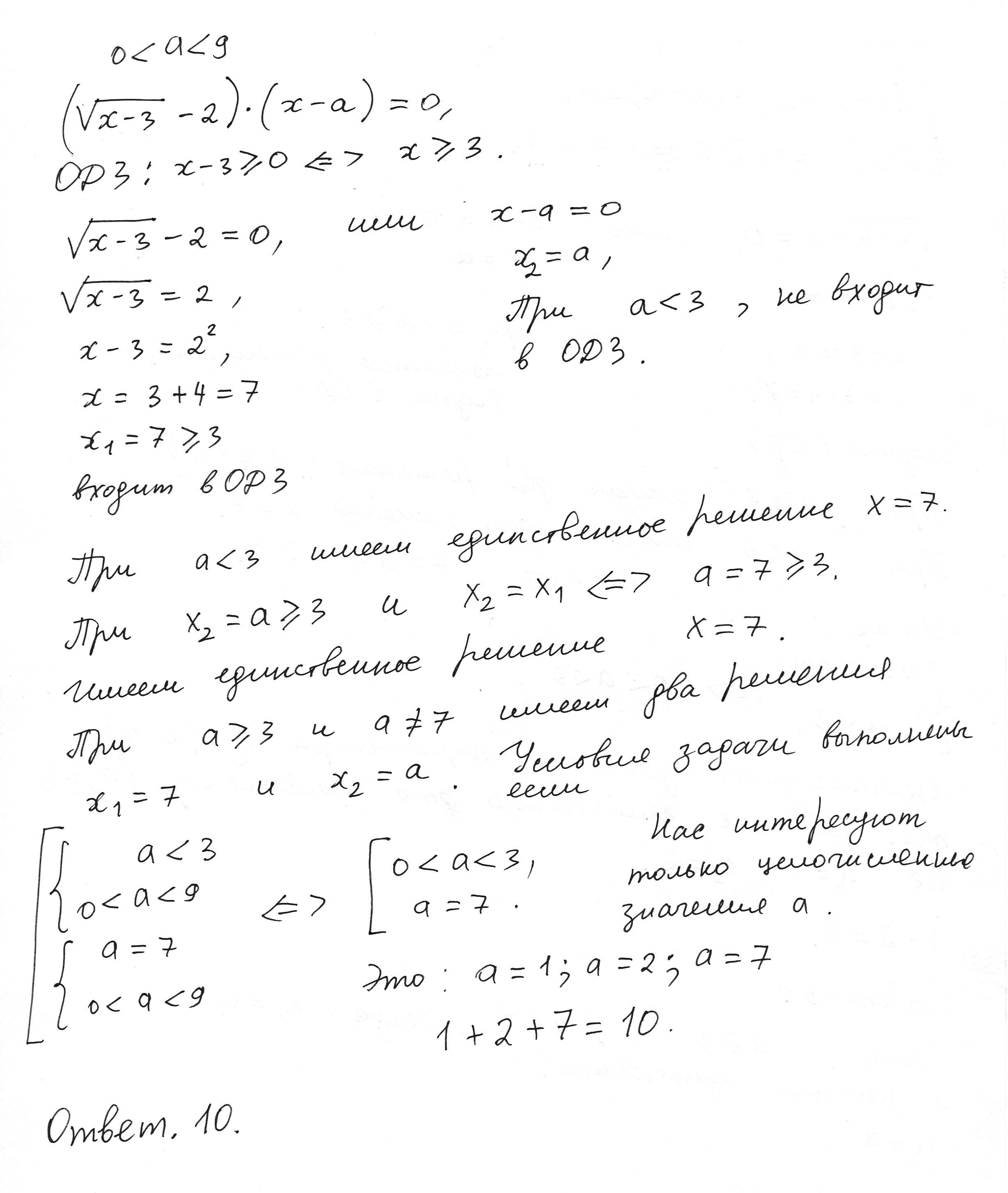 Укажите целое значение параметра а (если оно единственное) или сумму целых значений из промежутка (0;9), при которых уравнение (√(x-3)-2)*(x-a)=0 имеет единственное значение