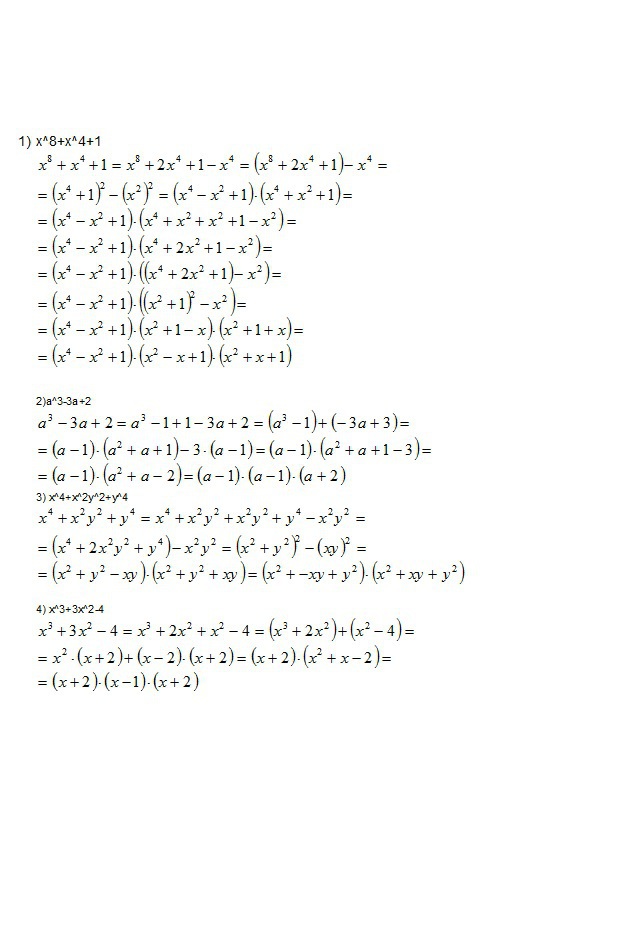 1) x⁸+x⁴+1 = (x⁴)² + 2x⁴ +1² - x⁴ = (x⁴+1)² - (x²)² = (x⁴+1-x²)(x⁴+1+x²) =