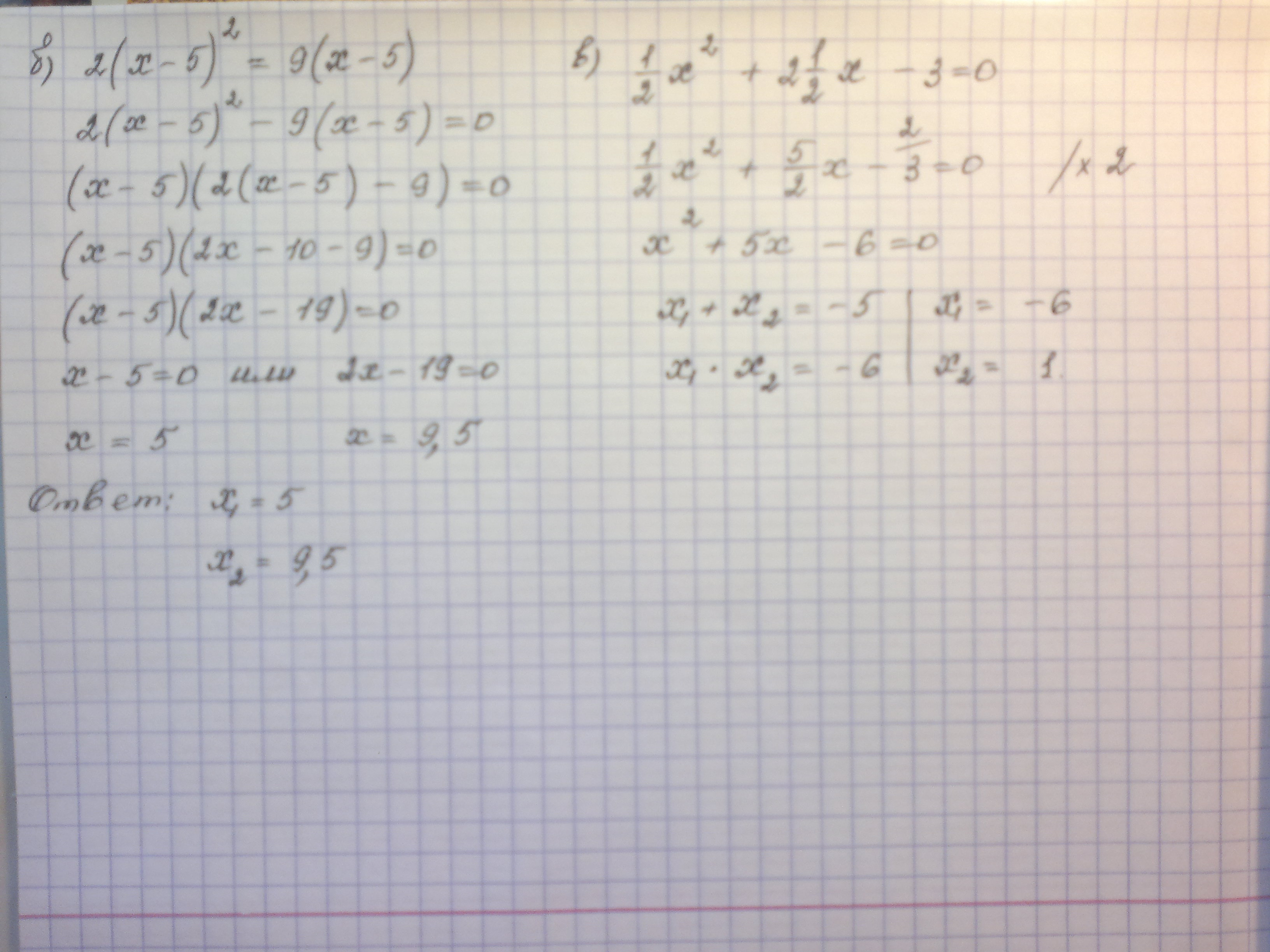 помогите решить уравнения. а) 4-9(x-3)^2=0. б)2(x-5)^2=9(x-5). в) 1/2х^2+2 1/2х-3=0. г)(x-3)^4-13(x-3)^2+36=0