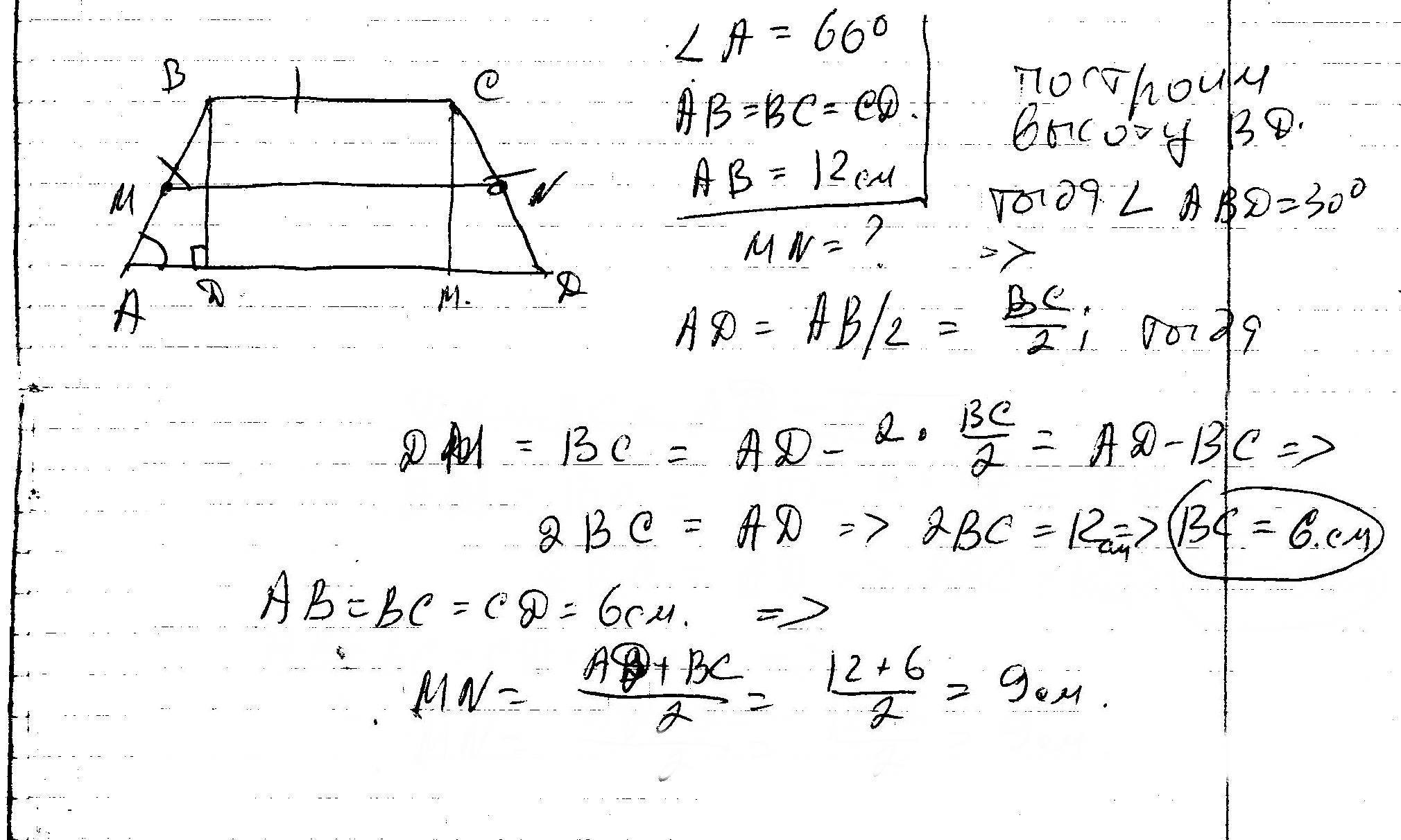 угол при основании равнобедренной трапеции равен 60 градусов боковая сторона равна меньшему основанию трапеции большее основание равно 12 см найдите длину средней линии трапеции.рис пож