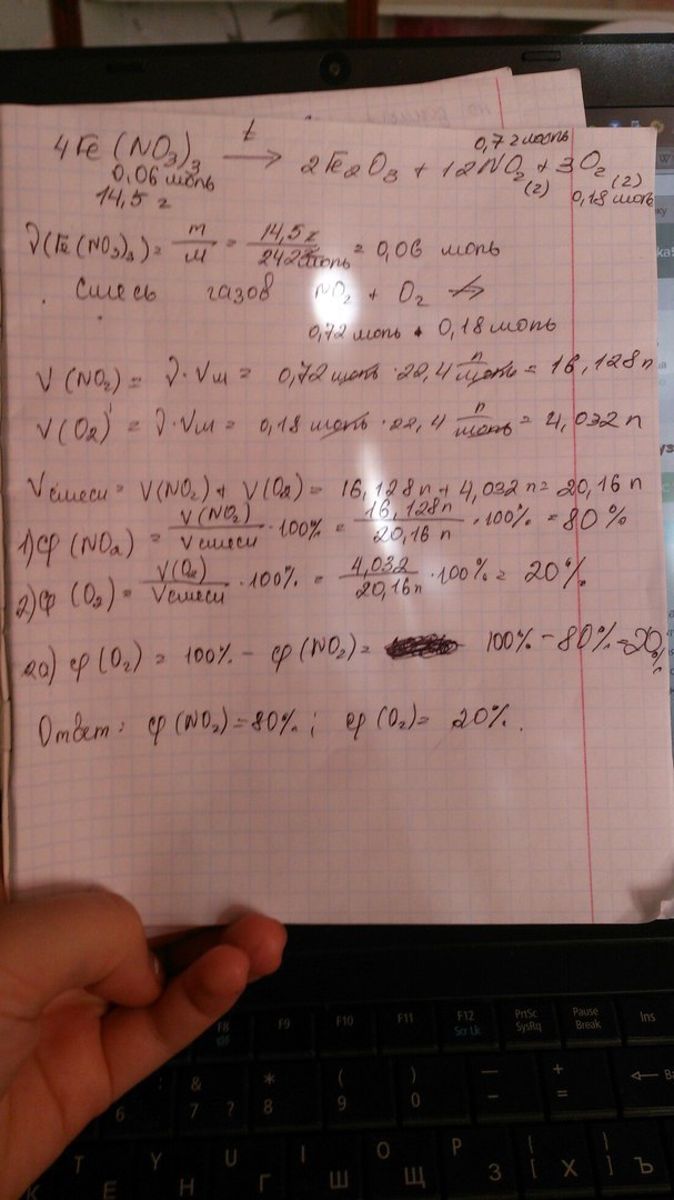 рассчитайте объёмные доли газов в их смеси, полученной при термическом разложении 14,5 г нитрата железа (|||). Помогите пожалуйста!!! Очень срочно нужно!!! Заранее огромное спасибо!!!...