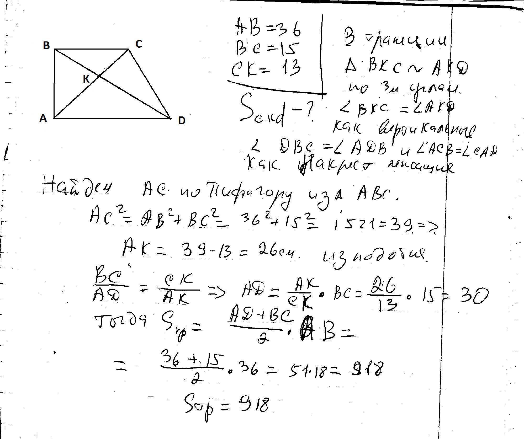 в трапеции abcd диагонали пересекаются в точке k . боковая сторона ab перпендикулярна основанифм трапеции . известно , что ab= 36 ,bc=15, ck=13. найдите площадь треугольника ckd