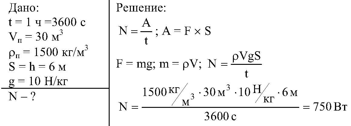 N = 1500 кг / м^3 * 30 м^3 * 10 H/ кг * 6м и это все разделить 3600 с = 750 Вт