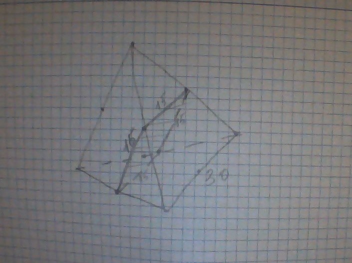 В сечении получился ромб со стороной 15 см, т.к. стороны ромба это средние линии треугольника и они равны половине параллельной стороне треугольника. Периметр = 15*4=60 см. Рисунок на отдельном листке.