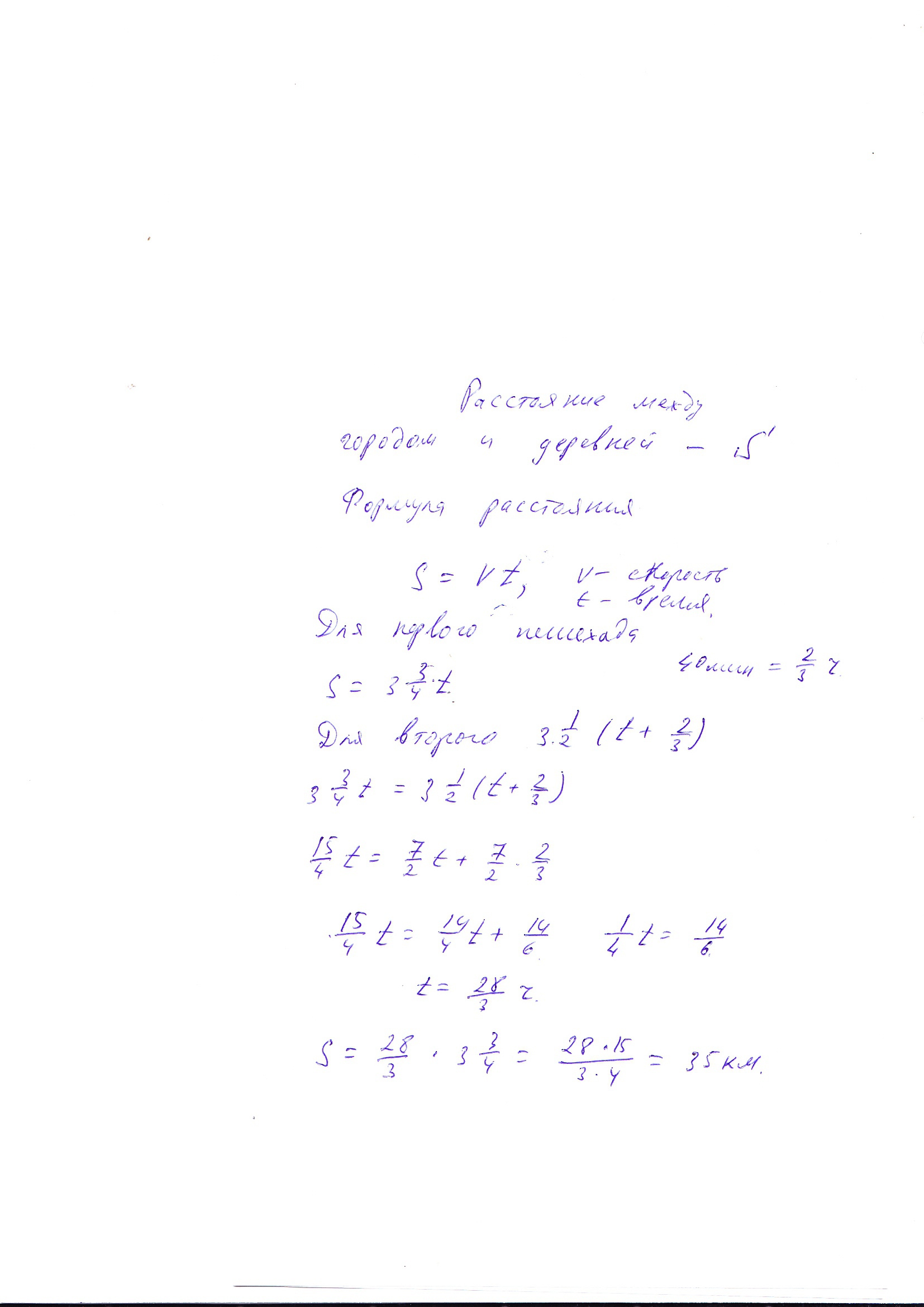 Из деревни в город одновременно вышли два пешехода. Первый пришёл в город на 40 минут позже второго. Скорость первого - 3,5 км/ч, скорость второго 3 целых 3/4 км/ч (смешанное число). Найти расстояние между деревней и городом.