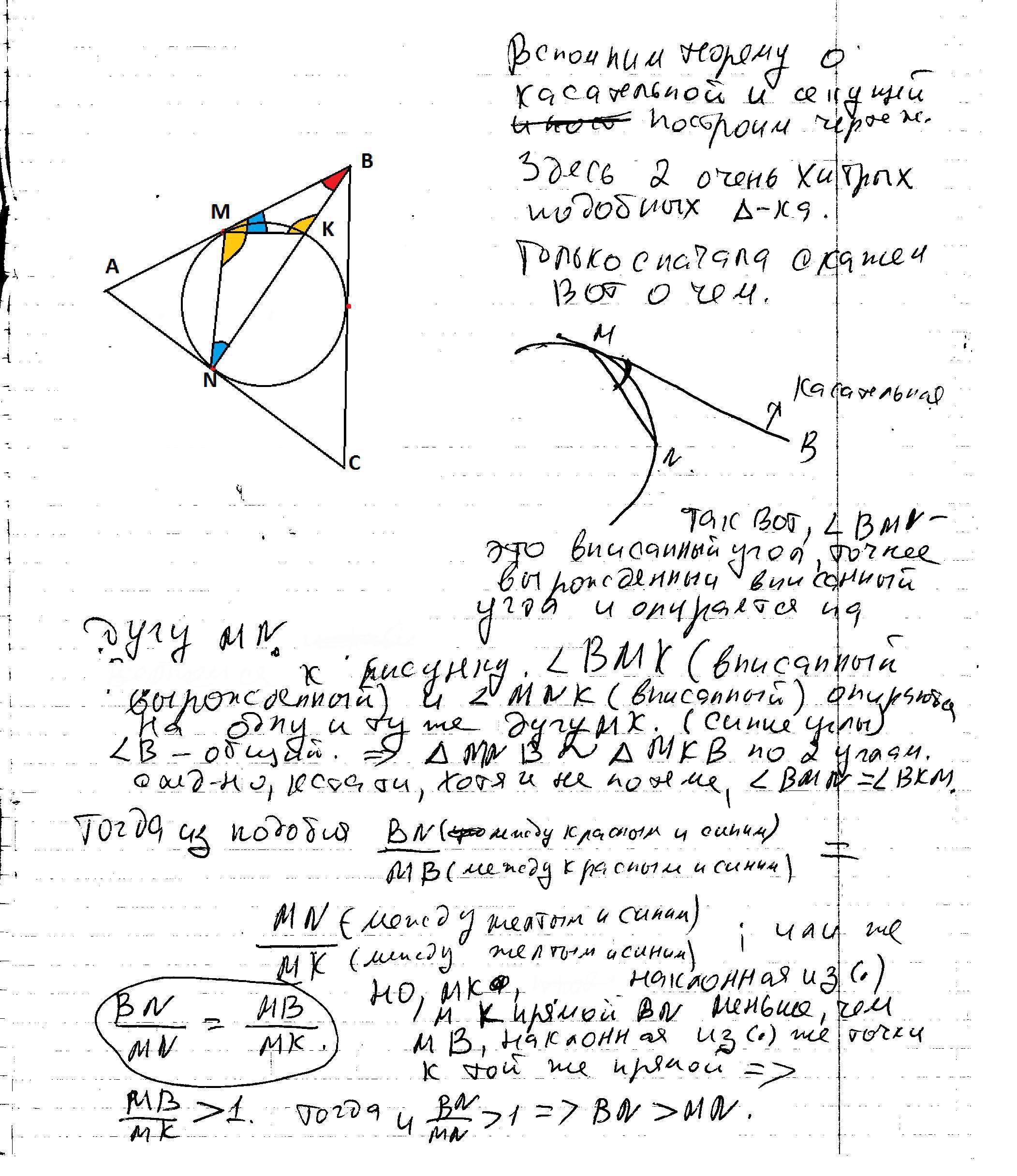окружность вписанная в треугольник ABC касается его сторон AB и AC соответственно в точках M и N. докажите, что BN>MN