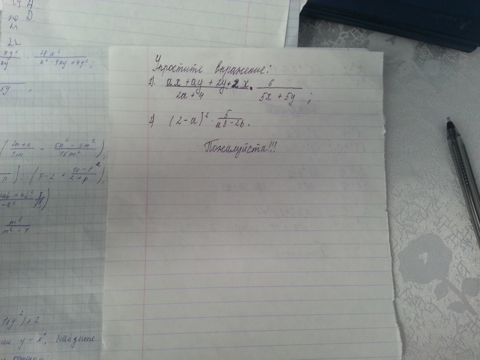 frac{ax+ay+2y+2x}{2a+4} * frac{6}{5x+5y} = frac{a(x+y)+2(x+y)}{2(a+2)} * frac{6}{5(x+y)} = frac{(x+y)(a+2)}{2(a+2)} * frac{6}{5(x+y)} = \  \ = frac{6}{2*5} =0.6 \  \ (2-a) ^{2}* frac{5}{ab-2b}  = frac{(2-a) ^{2} *5}{-b(2-a)} = frac{5(2-a)}{-b} = -frac{10-5a}{b}  \
