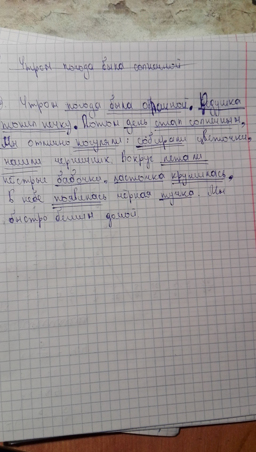 Утром погода была облачной.Дедушка топил печку.Потом день стал солнечным мы отлично погуляли,собирали цветочки нашли черничник.Вокруг летали пестрые бабочки,ласточка кружила в небе.Появилась черная тучка,мы быстро пошли домой.