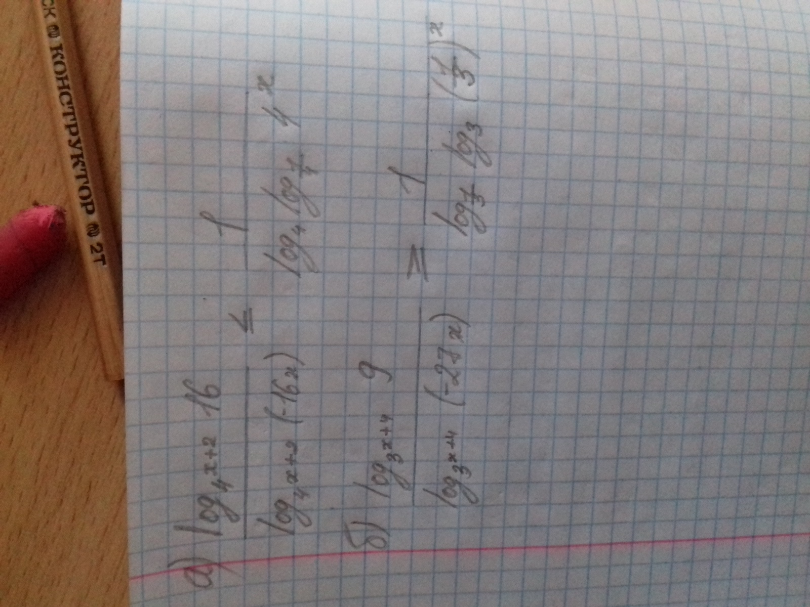 Ищем ОДЗ. Начнем с основания логарифмов в левой части: 4^(x+2). Основания должны быть больше 0 и не равны единице. Получаем условие x≠-2. Теперь разбираемся с тем что находится внутри логарифмов. Все это должно быть положительно. -16x>0 <=> x<0.