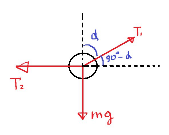 Шар весом 5 Ньютон подвешен меж двумя нитями. Одна нить расположена горизонтально, другая отклонена от вертикальной оси на 60 градусов (угол а - угол в центре шара, между вертикальной осью и нитью). Вся система находится в покое.