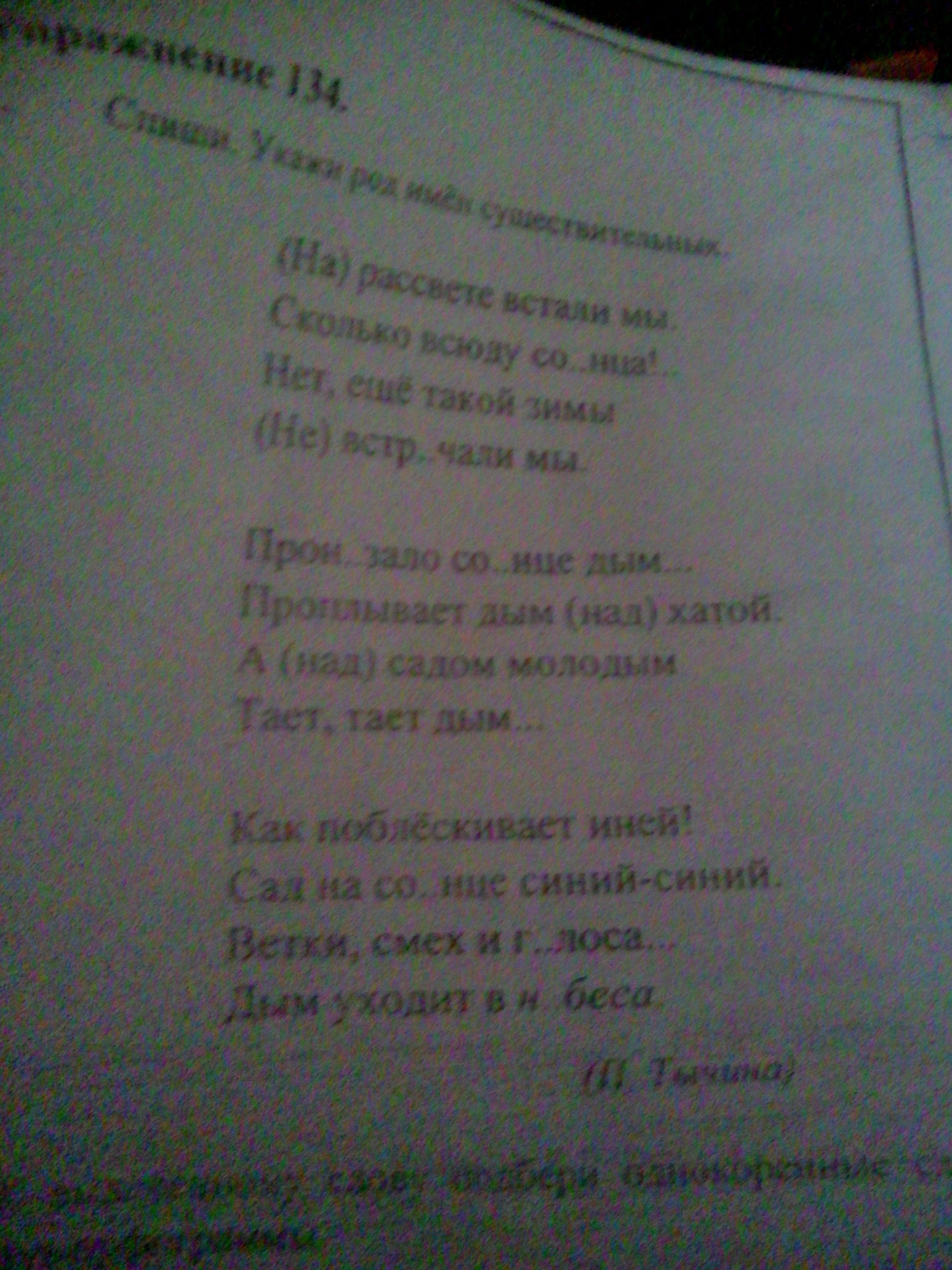Рассвете(м.р),солнце(ср.р),зимы(Ж.р),солнце(ср.р),дым(м.р),,хатой(Ж.р),садом(м.р),дым(м.р),иней(м.р),сад(м.р),ветки(Ж.р),смех(м.р),голоса(м.р),дым(м.р),