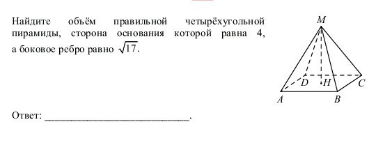 4) Объем пирамиды равен V=1/3*S_ABCD*MH=1/3*16*3=16