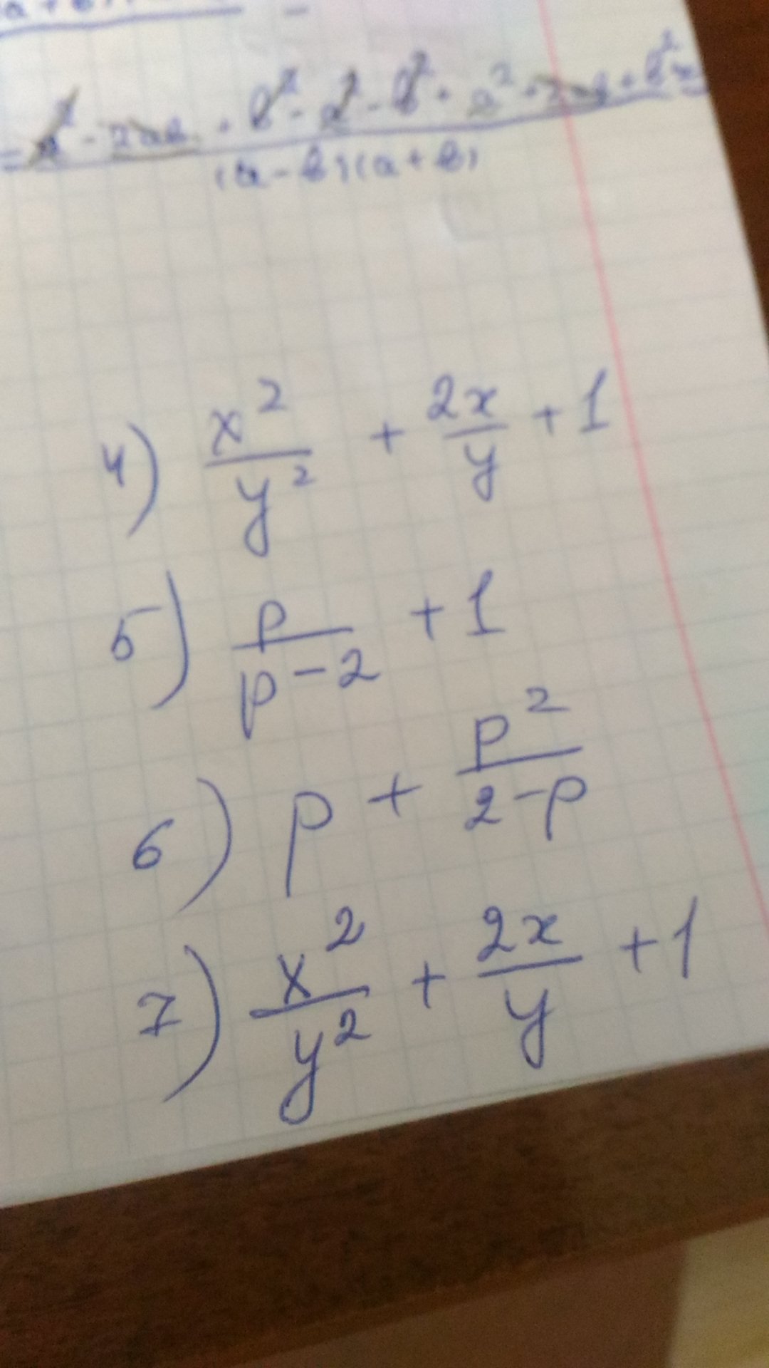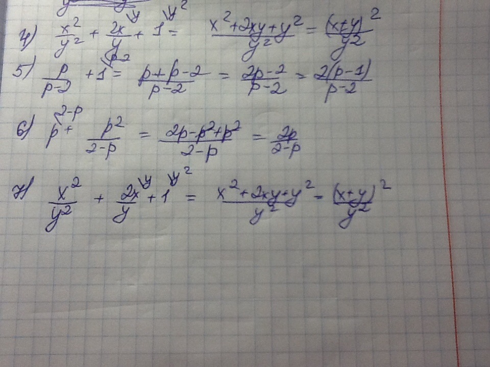 4) х²/у² + 2х/у + 1 = х²/у² + 2ху/у² + 1 = (х²+2ху)/у² + 1 = (х²+2ху)/у² + у²/у² =