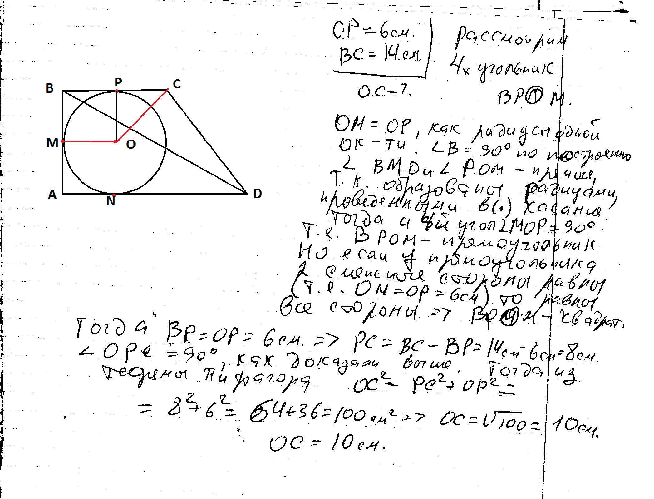 окружность центром которой является точка О, касается сторон АВ, ВС и AD прямоугольной трапеции ABCD. Точка Р - точка касания окружности и стороны ВС, ОР = 6 см, ВС = 14 см. Вычислите расстояние между точками О и С