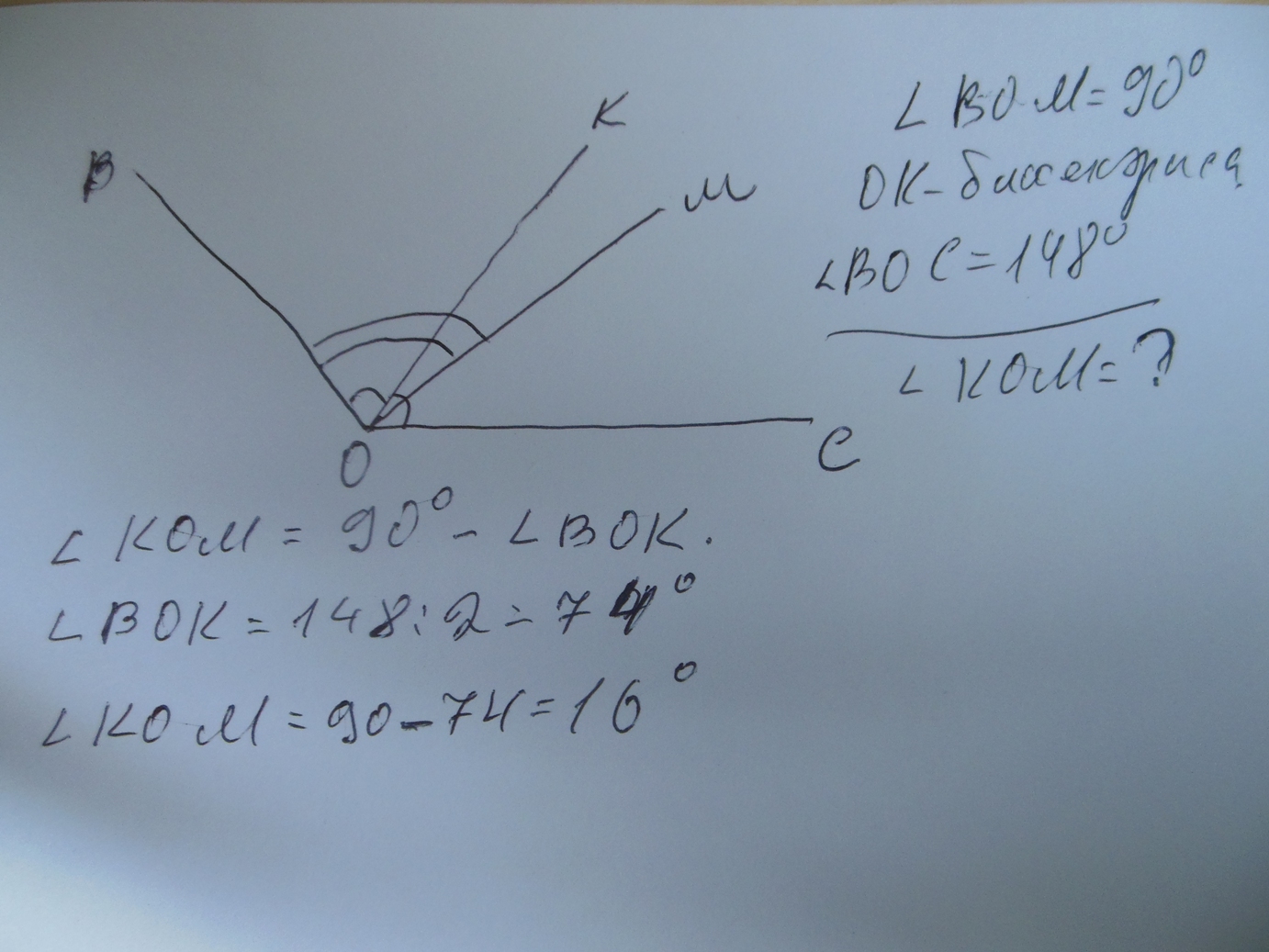 перпендикулярно сторон OC угла BOC проведен Луч OM , OK биссектриса угла BOC. Найдите величину угла KOM , если градусник мера угла BOC равна 148