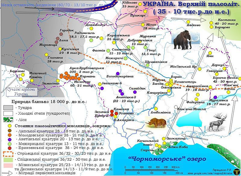 Перші люди на території сучасної України з'явилися в епоху раннього палеоліту, так звану ашельську добу, понад 900—800 тисяч років тому. Заселення відбувалося з заходу на схід, кількаразовими хвилями, і тривало до 100 тисяч років тому. У середньому палеоліті, у так звану мустьєрську добу, що тривала 100—35 тисяч років тому, територію України займали неандертальці. Антропогенез проходив в умовах періодичних зледенінь: гюнцького, міндельського, ріського і вюрмського, які формували природні зони України: тундру, лісостеп і степ. З кінця 5 до початку 3 тисячоліття до н. е. в Україні тривала доба енеоліту, що позначилась впровадженням мідних знарядь праці. Стала виразнішою господарча спеціалізація природно-кліматичних зон: скотарство у степу, хліборобство у лісостепу і мисливство у лісовій смузі.