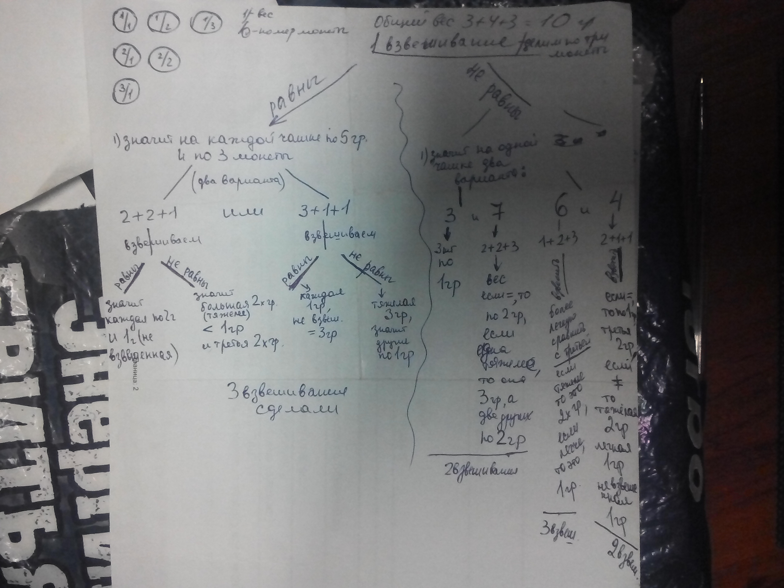 Имеются неразличимые на вид 6 монет, из которых три весят по 1 г, две - по 2 г, а одна - 3 г. Как за 4 взвешивания на чашечных весах узнать вес каждой