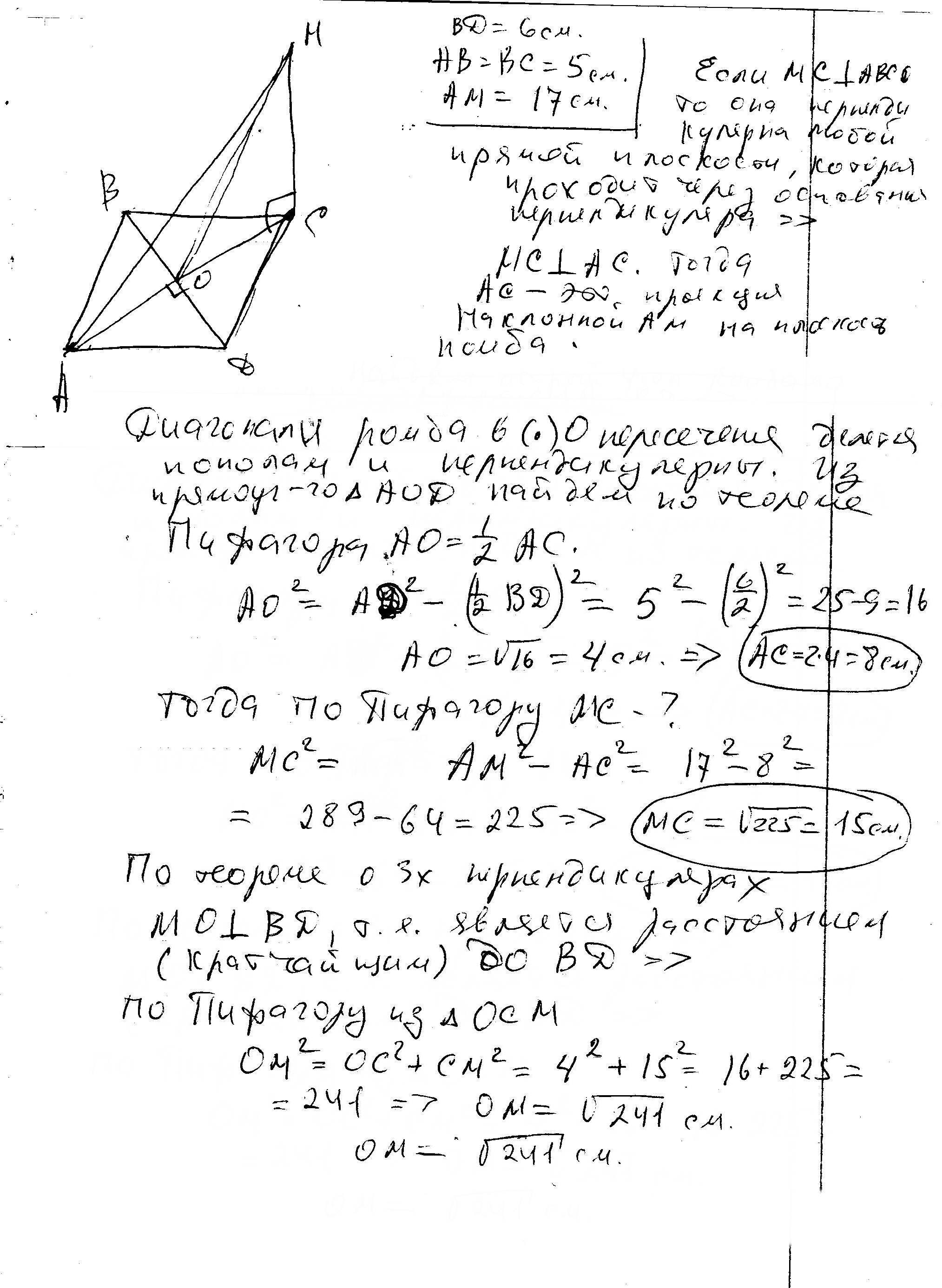 Из точки пространства к плоскости ромба, сторона которого равна 5 см, а меньшая диагональ - 6 см, проведён перпендикуляр. Основа перпендикуляра - вершина острого угла ромба. Расстояние от этой точки к вершине второго острого угла равно 17 см. Найдите расстояние от данной точки к прямой, которая содержит диагональ ромба.
