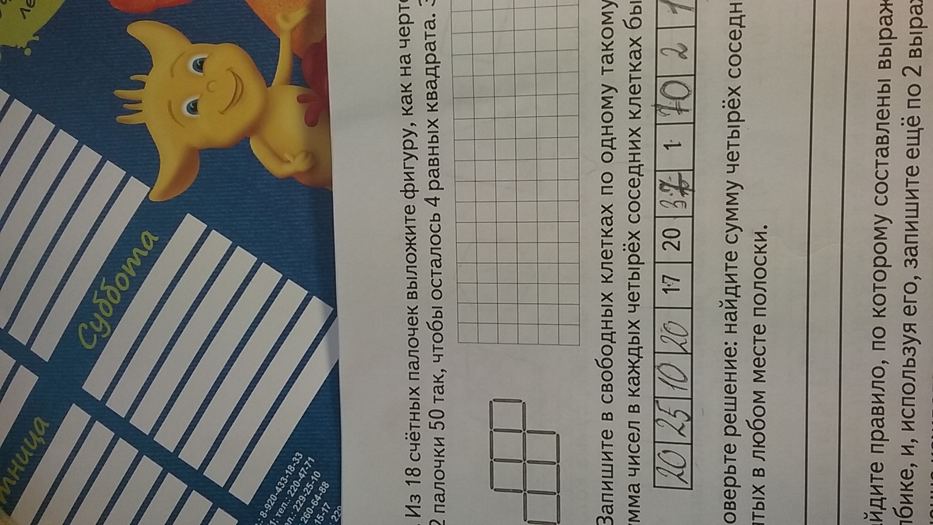 из 18 счетных палочик выложите фигуру , как на чертеже .Убери 2 палочки 50 так , чтобы осталось 4 равных квадрата .Зарисуйти их