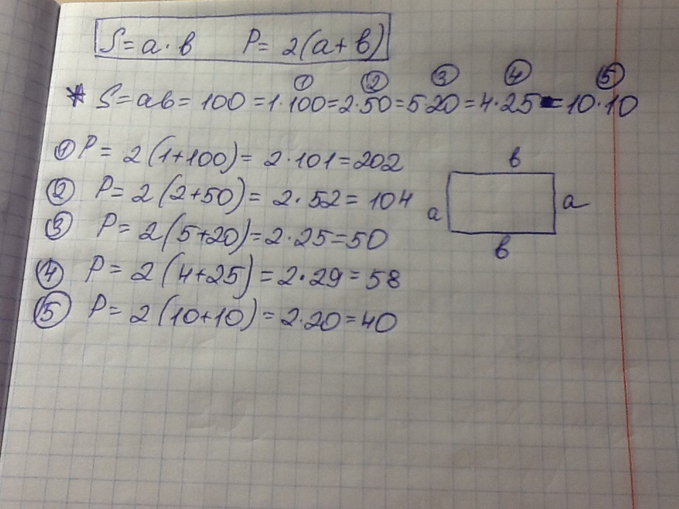 * Нужно представить число 100 как произведение 'а' и 'в', так как Площадь равна 'ширина умножить на длина'. (10 и 10 берём тоже, так квадрат - это такой же прямоугольник)