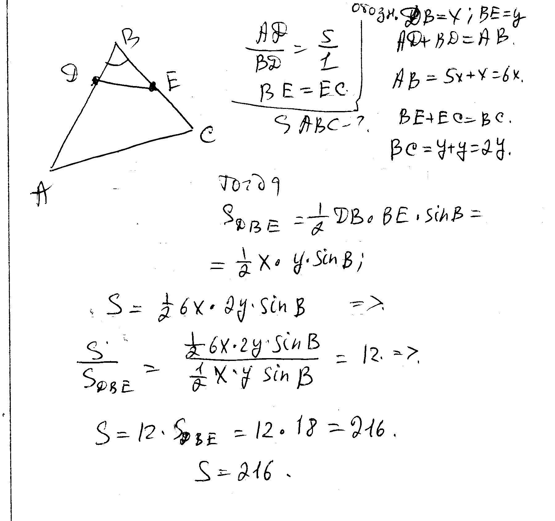На стороне АВ треугольника АВС взята точка D таким образом, что AD : DB = 5:1. На стороне ВС взята точка Е, делящая сторону ВС пополам. Известно, что площадь треугольника DBE равна 18. Вычислите площадь треугольника АВС