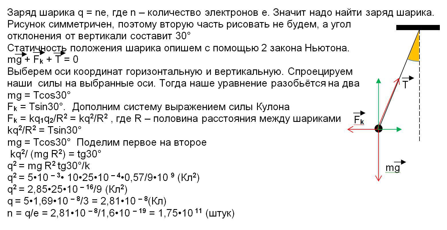 2 шарика массой 5 г каждый ,подвешенные в одной точке на шелковых нитях ,после получения одинаковых по величине отрицательных зарядов разошлись так , что расстояние между центрами стало 10см, а нити образовали угол 60 градусов.определить количество электронов,полученных каждым шариком.Заряд электрона 1,6*10 в -19 степени Кл. К=9*10 в 9 степени,tg 30 градусов =0,57