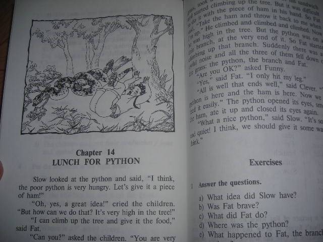 Он лез, лез и лез. Он сейчас был высоко на дереве. Но питон сидел на тонкой ветке, на самом её конце. И Толстяк начал лезть на эту ветку. Но вдруг раздался ужасный грохот и все трое упали на землю - питон, ветка и Толстяк.