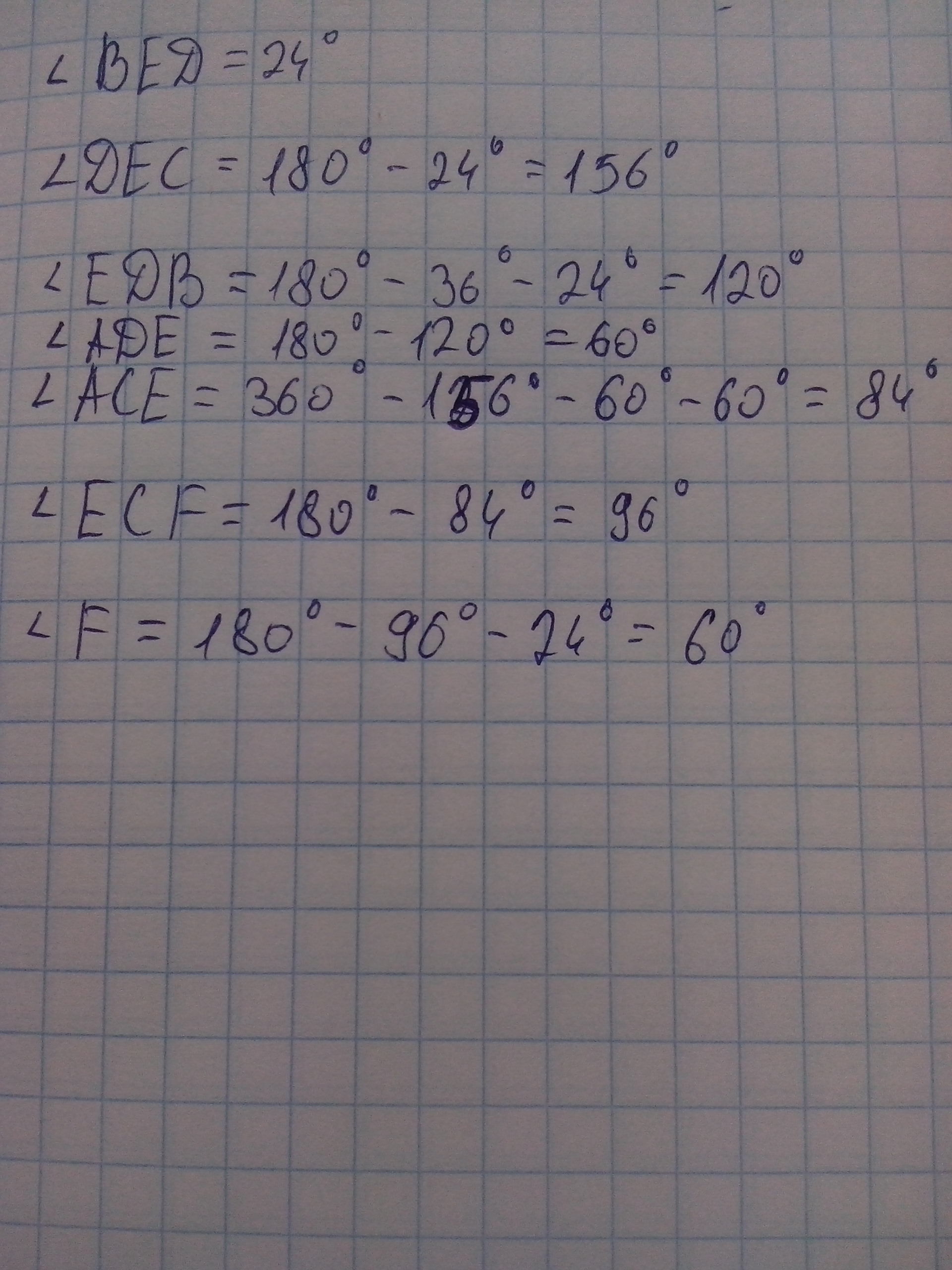 ∠F=180-(∠FEC+∠ECF)=180-(24+96)=60