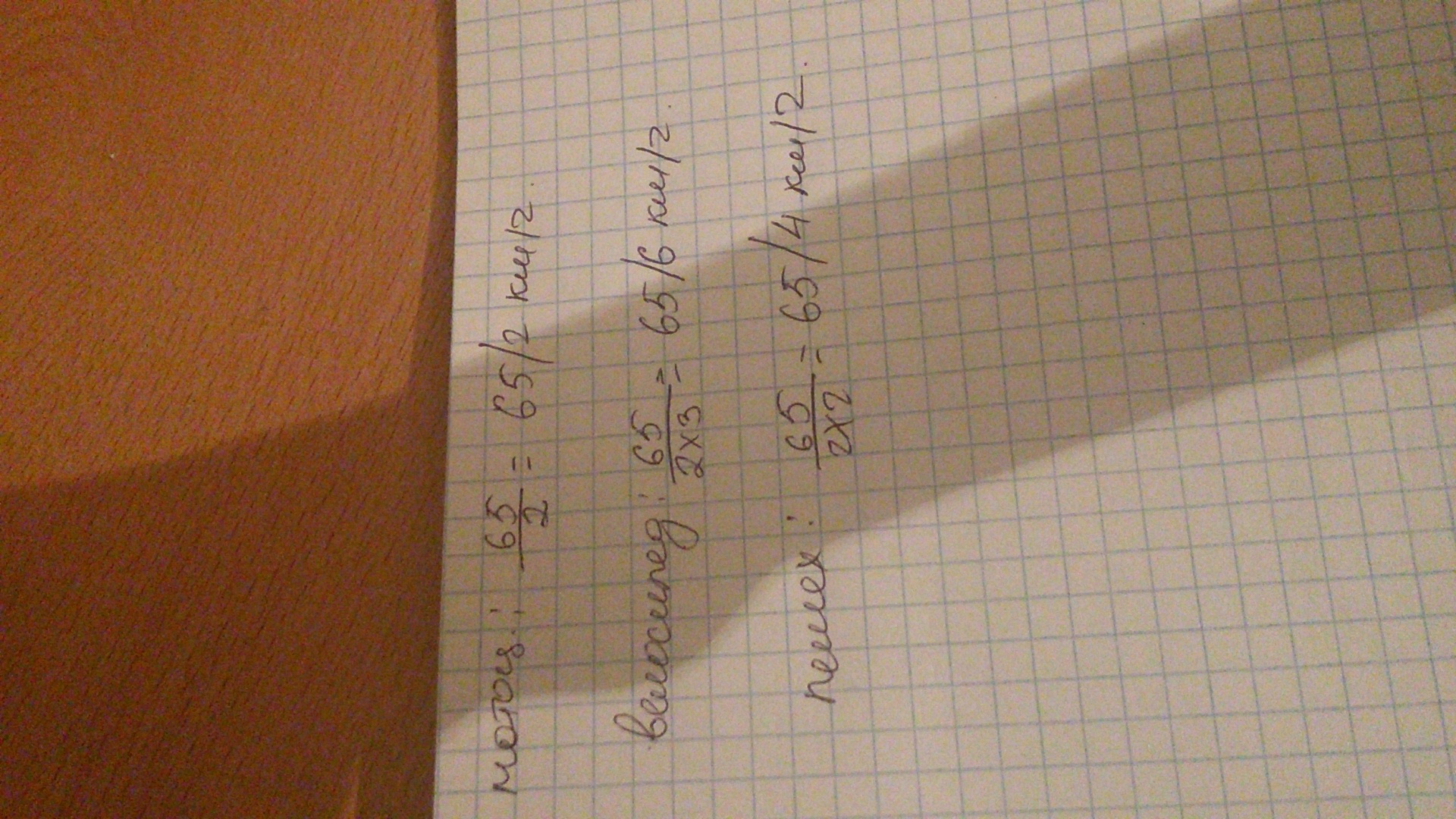 расстояние между двумя населёнными пунктами 65 км.Если это расстояние мотоциклист преодалевает за 2 часа, то велопесидист тратит времени в 3 раза больше, а пешеход-в2 раза больше, чем велосепидист.Найди скорость каждого из них?