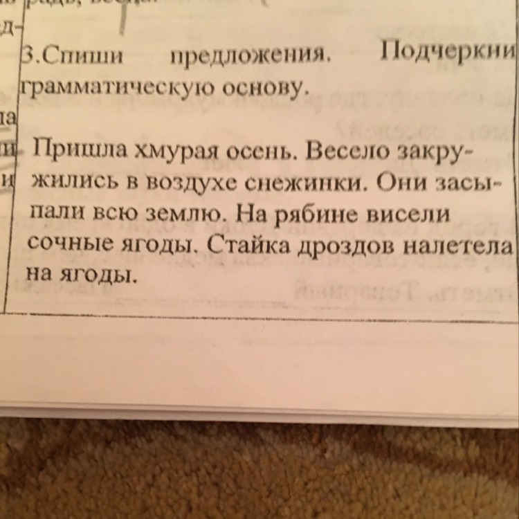 Основы - 1) осень ( одной чертой подчеркиваешь) пришла( двумя) . 2) снежинки (одной) закружились. ( двумя) 3) они ( одной) засыпали ( двумя). 4) ягоды ( одной) висели ( двумя) 5) стайка( одной) налетела ( двумя)