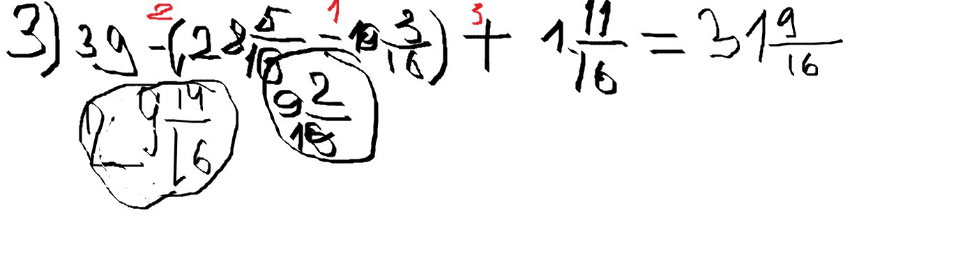 2) вначале в скобках=1 целая и 6/16.потом 17 целых и 5/16 минус 8целых и 1/16=9 целых и 4/16.потом 9 целых и 4/16 плюс 1 целая и 6/16=10 целых 10/ или 10целых и 5/8 ( сократили) 3) третий номер в пайнте. то что в кружочеке .,то ответ