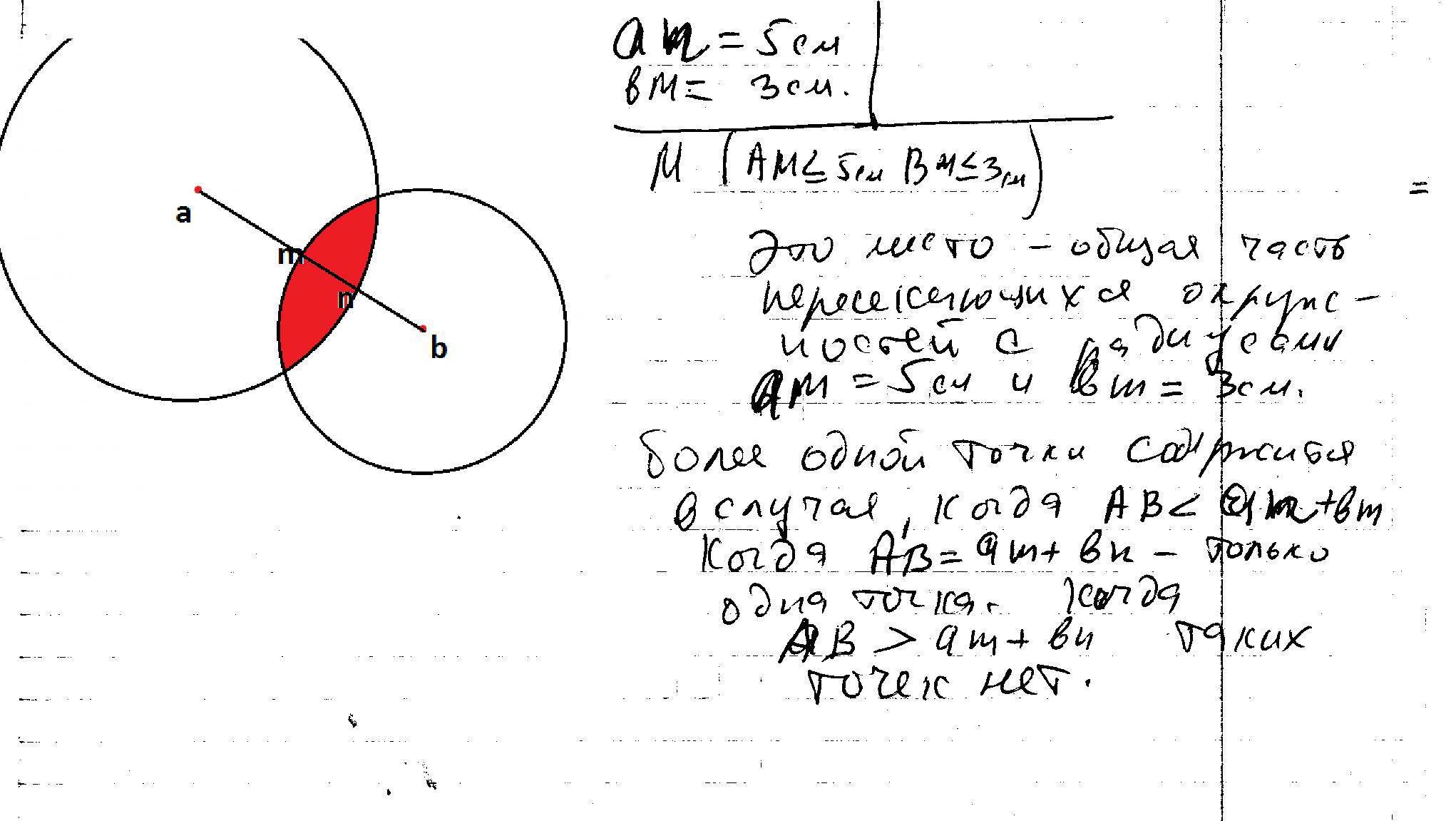 2) Если AB=8, то пересечением является одна точка M (здесь AM=5, BM=3)
