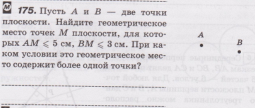 Разберем по частям задачу. Геометрическое место точек M, для которых выполняется первое условие, то есть AM <=5, это круг радиуса 5. Аналогично для BM - это круг радиуса 3. Если объединить эти условия, чтобы выполнялось каждое из них, получится пересечение этих кругов. Это пересечение и будет являться искомым геометрическим местом точек M. Возможны несколько случаев взаимного расположения точек A и B. От этого зависит пересечение кругов.