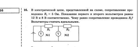 В электрической цепи, представленной на схеме, сопротивления проводника R1=5 Ом. Показания первого и второго вольтметров равны 12 В и 8 В соответственно. Чему равно сопротивление проводника R2? Вольтметры считать идеальными.