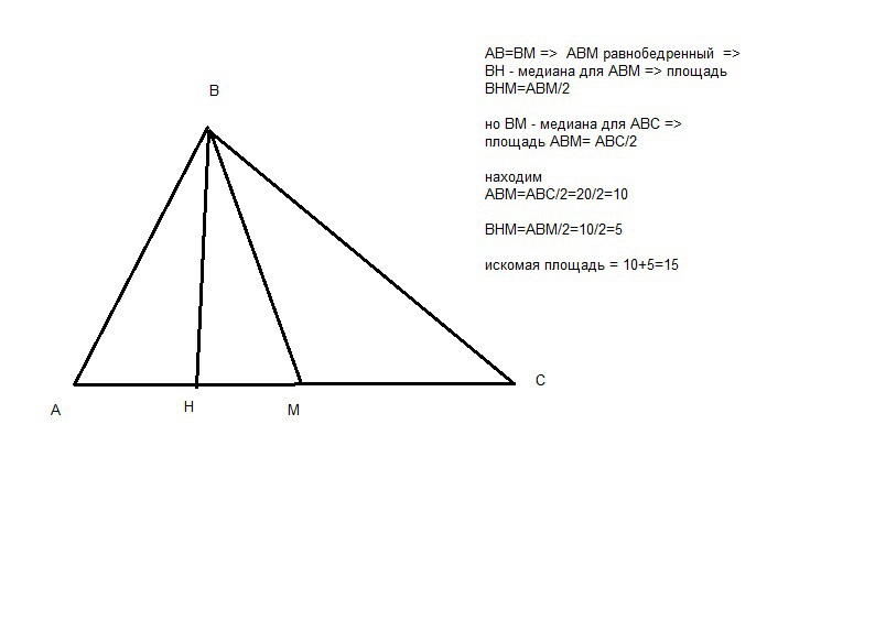 в треугольнике авс вн- высота вм -медиана ва=вм найдите площадь треугольника внс если площадь треугольника авс=20