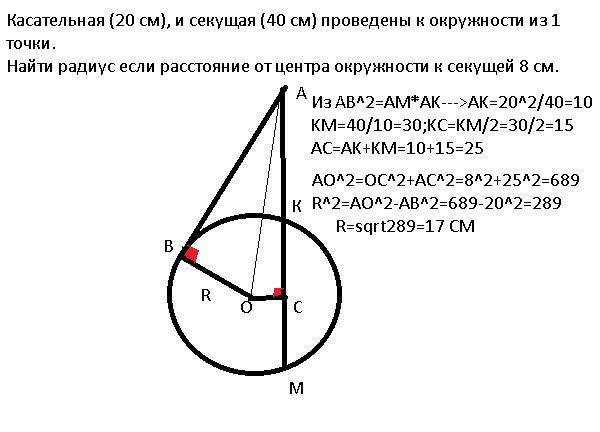 Касательная (20 см), и секущая (40 см) проведены к окружности из 1 точки.