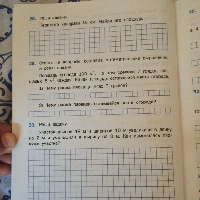 номер 29 умнож семь на пять и получиш площядь грядок 5×7=35 а потом отнеми 35 от ста и получишь остаток номер 30 18 ×10=180сначала было 18+2=20 10-3=7 20×7=140 потом стало сто сорак