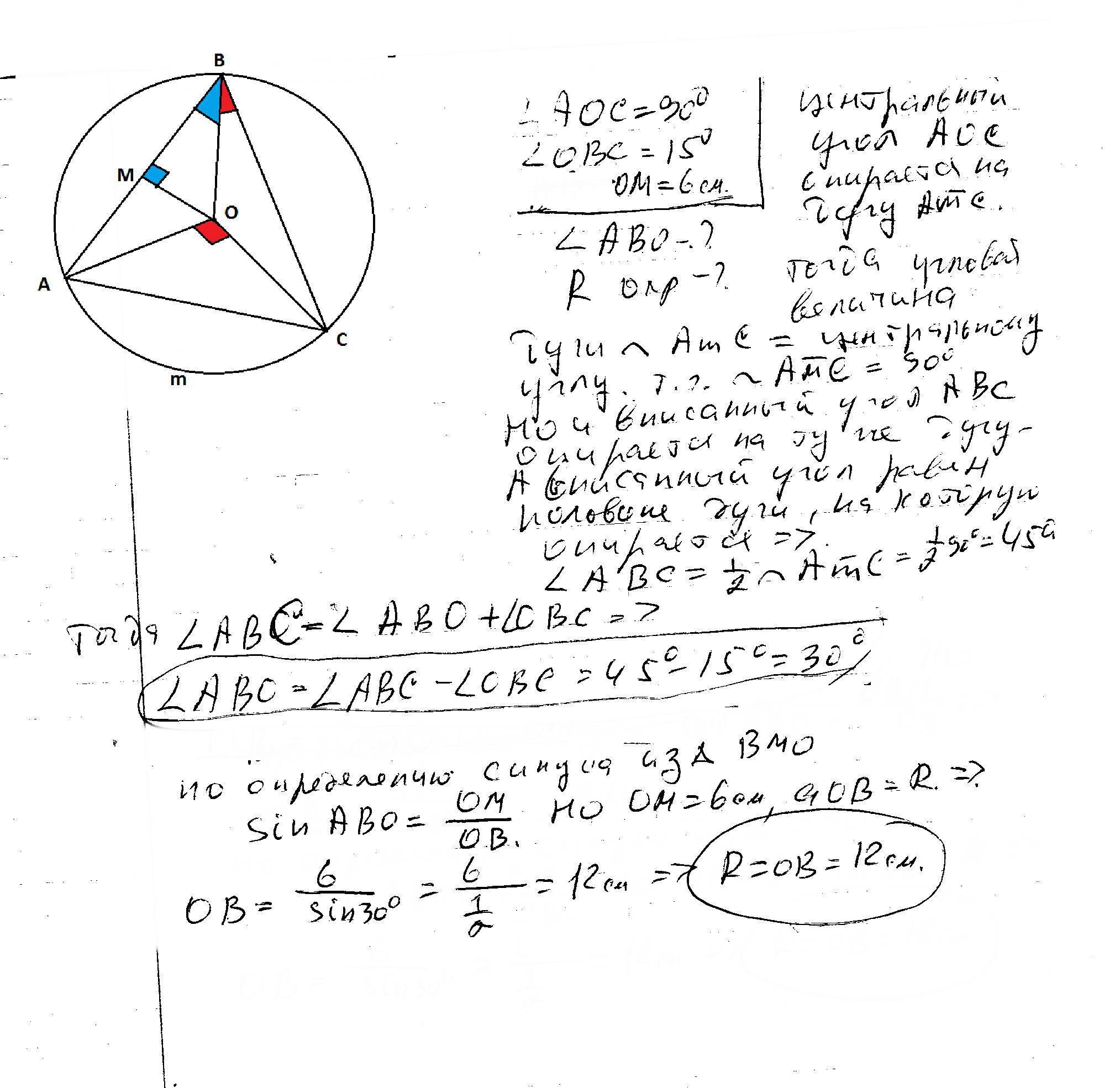 Около остроугольного треугольника АВС описана окружность с центром О. Расстояние от точки О до прямой АВ равно 6 см, угол АОС = 90°, угол ОВС = 15°.