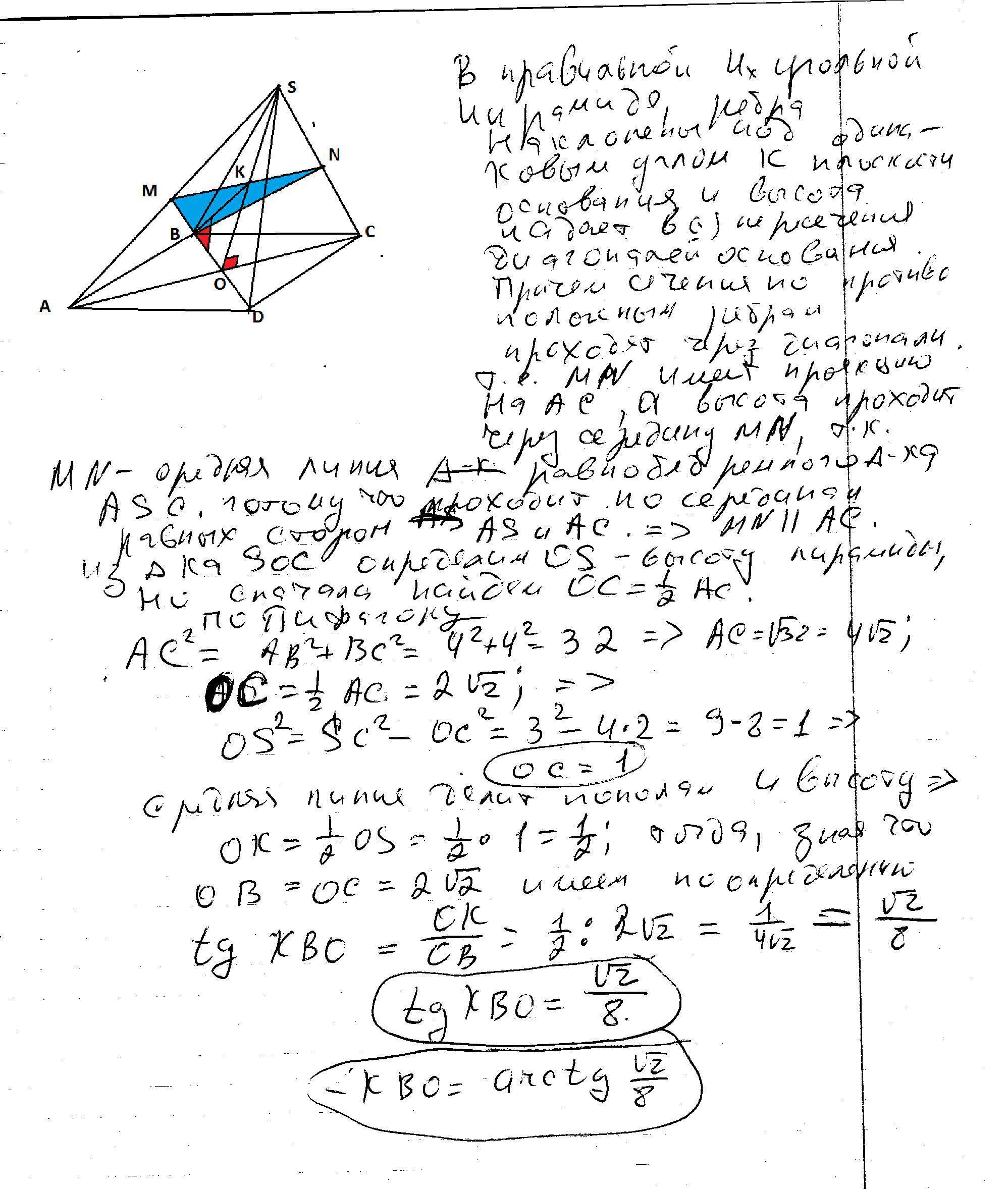 В правильной четырехугольной пирамиде SABCD точка M-середина рёбра SA, точка K-середина рёбра SC. Найдите угол между плоскостями BMK и ABC, если AB=4, SC=3